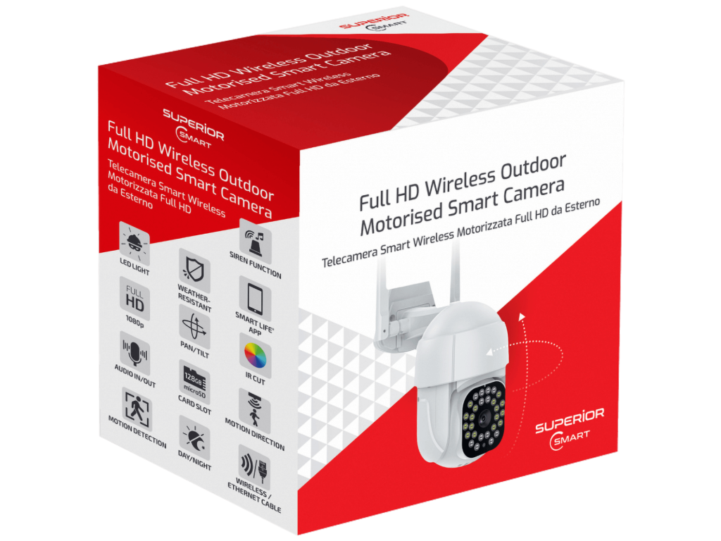 Funkcije: live video, snimanje, motorizovana funkcija "prati me", mikrofon, noćni režim, alarm, integrisano LED svetlo