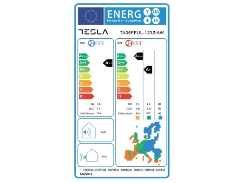 Zidni klima uređaj Tesla TA36FFUL-1232IAW odlikuje se naprednom inverterskom tehnologijom s ekohladnjacima, koja osigurava visoku energetsku učinkovitost i ekološki je prihvatljivija. Opremljena je Wi-Fi funkcijom, samodijagnostikom i skrivenim LED zaslonom osjetljivim na dodir. Klima je uvrštena u energetski razred A ++ / A +.
