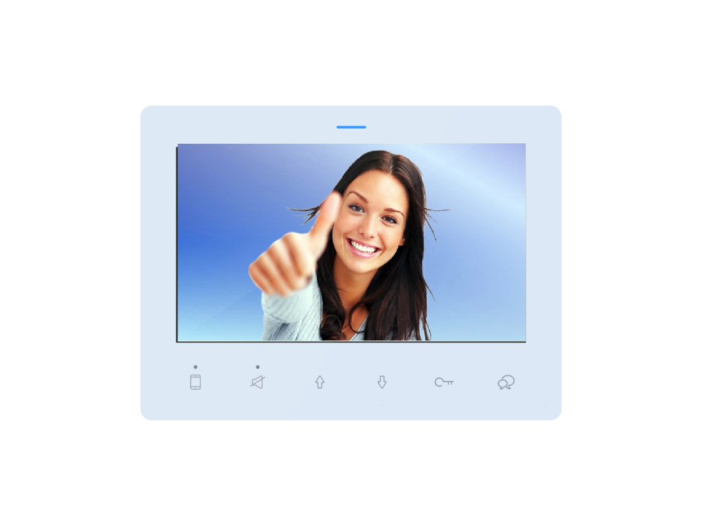 VTEK video monitor DF7 WS. Stakleni front panel.. 7″ kolor LED ekran. Touch tipke za razgovor i otvaranje vrata. Podešavanje melodije zvona i glasnoće panel/vrata zasebno. Do not disturb funkcija.Bijela boja. Preporučen za manje sustave do 16 monitora.